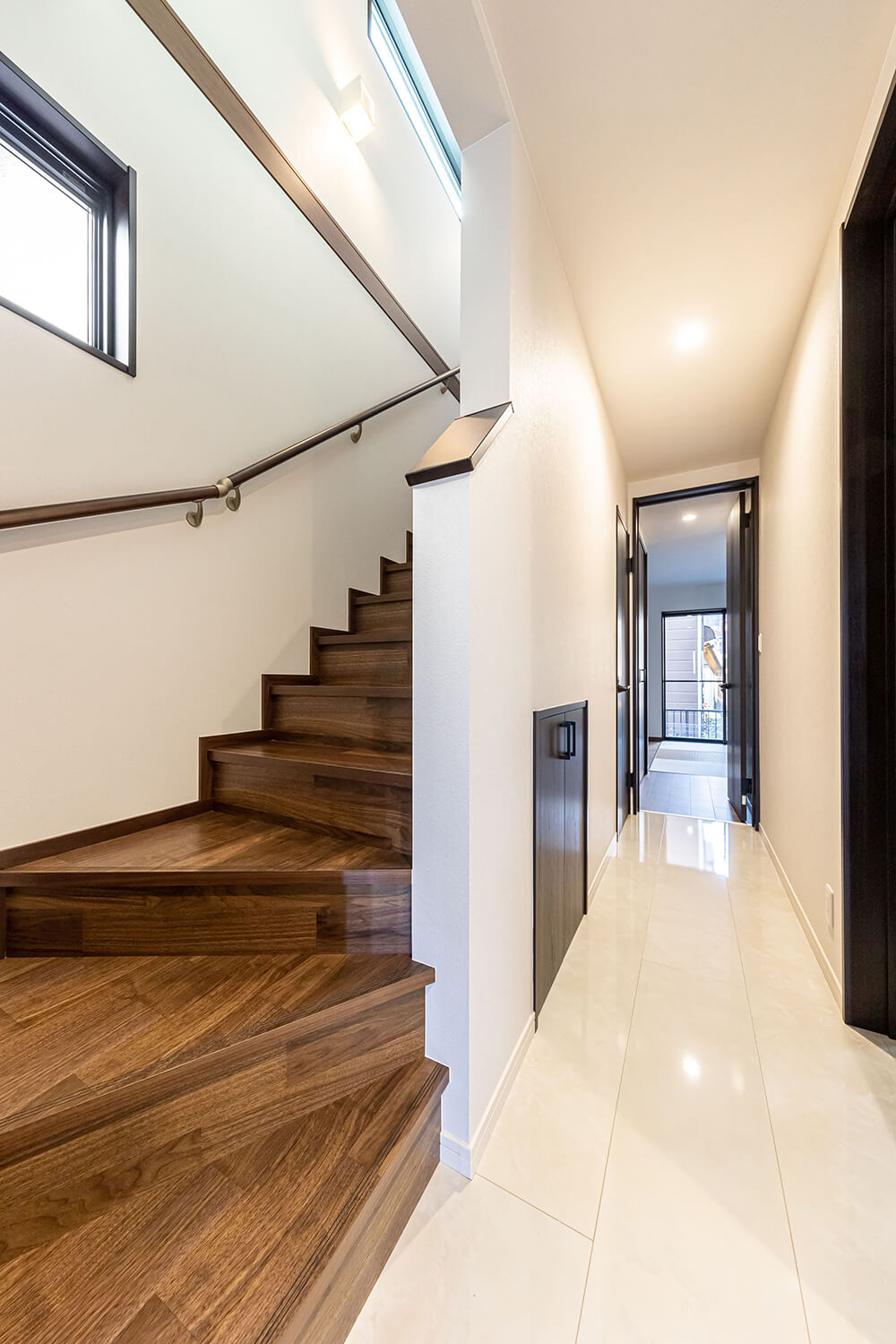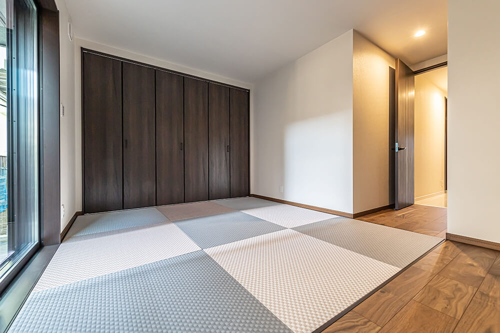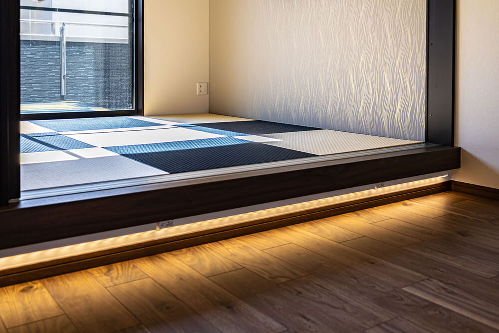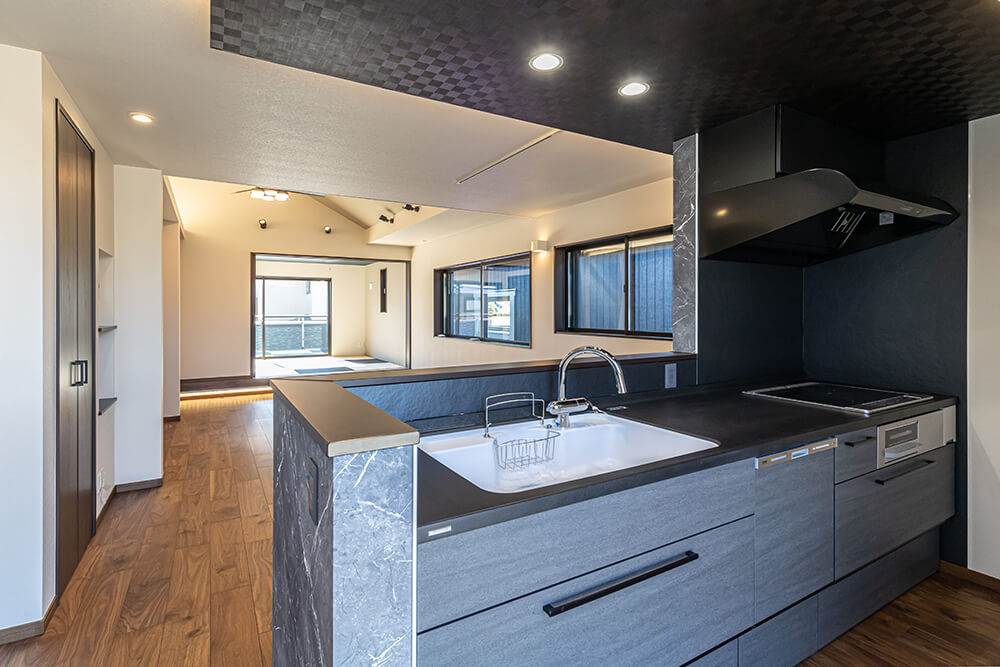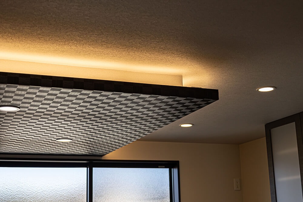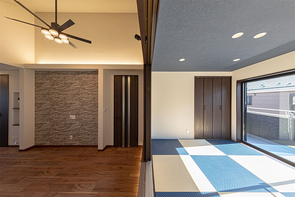 優美なリビングダイニングから覗く、和室が印象的なお住まい。 日中は大きな窓から光が差し込み、日が暮れるとこだわりの照明が暖かくお部屋を照らします。 時間・場所によって、様々な表情を楽しむことができる住宅に仕上がりました。