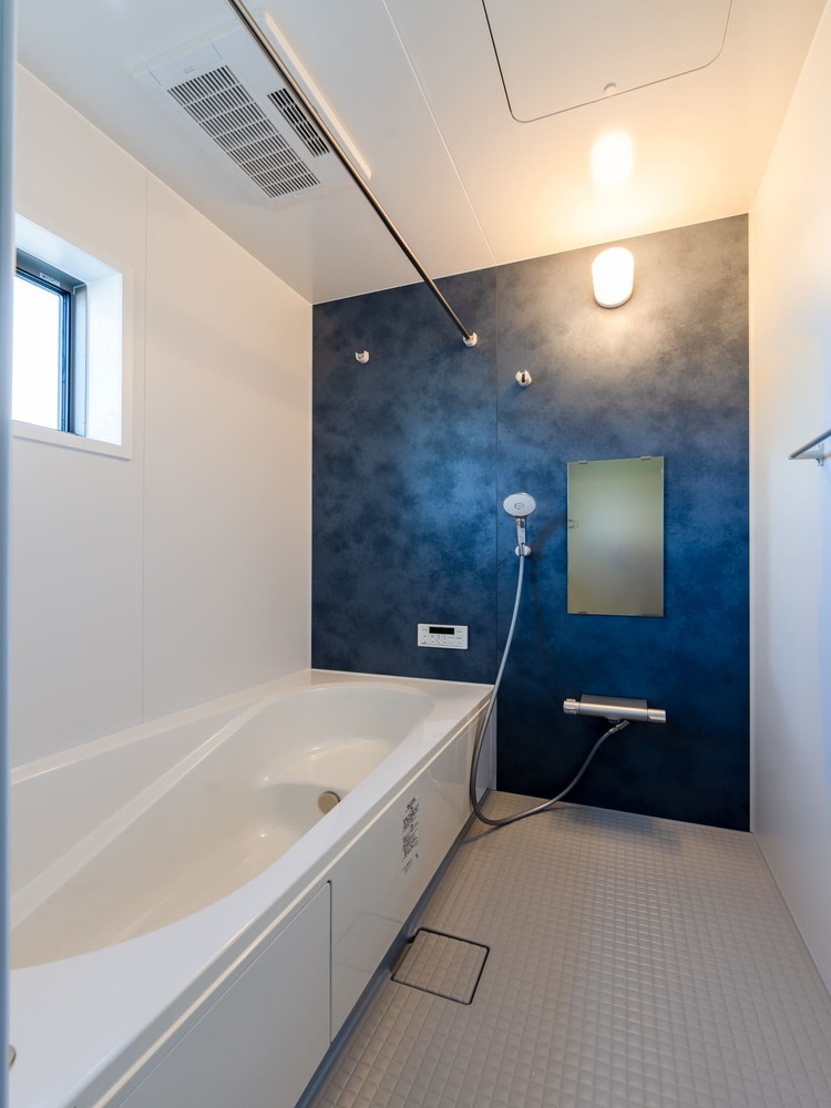 キッチンやバスルームなどの水回りには、シックなカラーをセレクト。 キッチン背面のアクセント壁や、バスルームの深いブルーのパネルは、空間全体を引き締め、注文住宅ならではの「こだわり」を演出します。 限られた予算の中で、どこにコストをかけ、どこをシンプルにするか。そのメリハリが、住まい全体の完成度を高めています。